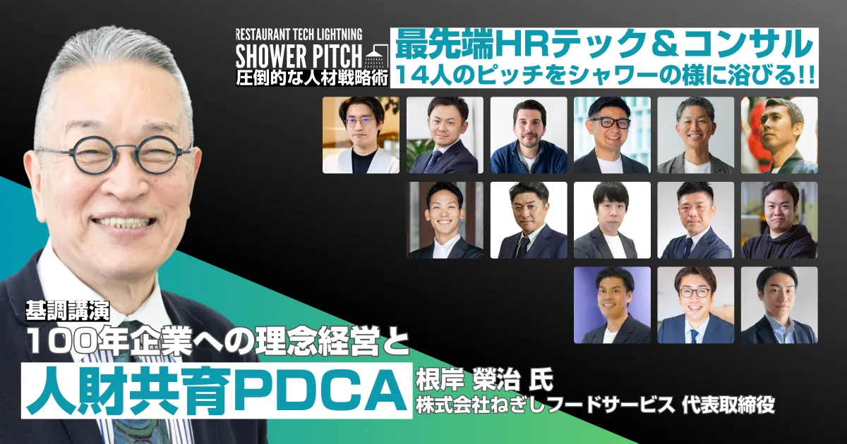 飲食業の人材課題を解決する最前線のHRテック&コンサルティングサービスが一堂に集結し、1社あたり8分間で最先端の飲食店向けITサービス(レストランテック)をアピールするピッチイベントです。今回は「圧倒的な人財戦略術」をテーマに、飲食店の人事や労務などHR領域に貢献するシステムを提供する14社が、サービス紹介、導入事例、デモ実演などを行います。また、基調講演には、株式会社ねぎしフードサービス代表取締役の根岸榮治氏が「100年企業への理念経営と人財共育PDCA」をテーマに登壇を予定しています。